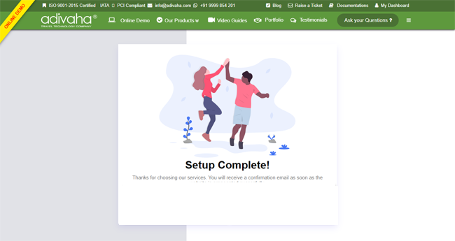 3. You will now land to the confirmation page with the links to your white label travel website and the backoffice. Generally, it takes few minutes to get the site published, but at times it may take 24-48 hrs. You should receive an email with the login info. Wasn't that easy?